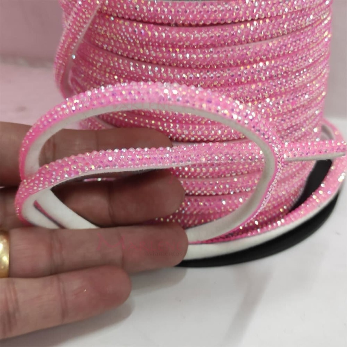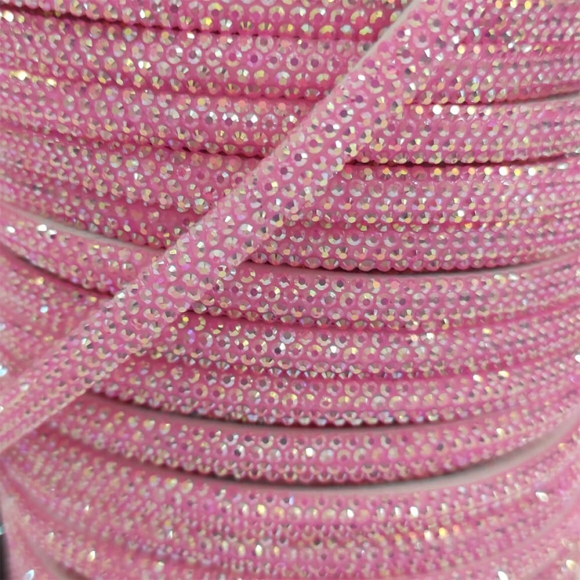 Uso: Tubo de strass ou strass meia cana, usado na confecção de vestuários, calçados como sandália e chinelos personalizados , tiaras, pulseiras, entre outros trabalhos criativos. Possui um lado macio e o outro lado vai com o strass. Deixa os trabalhos super diferenciados, além de causar um efeito luxuoso pelo brilho e qualidade do material.