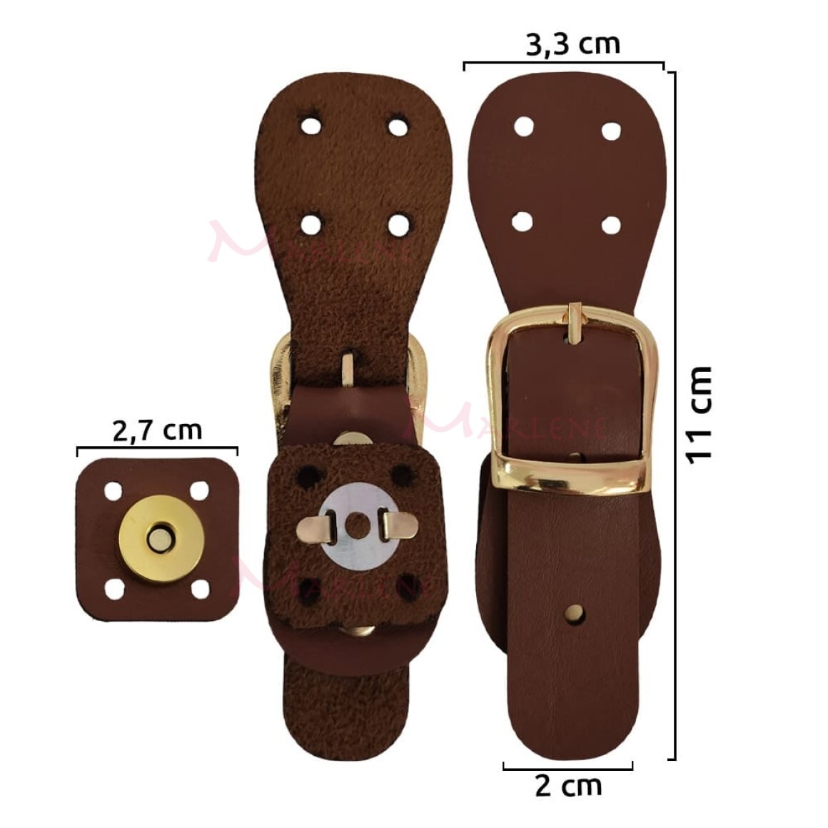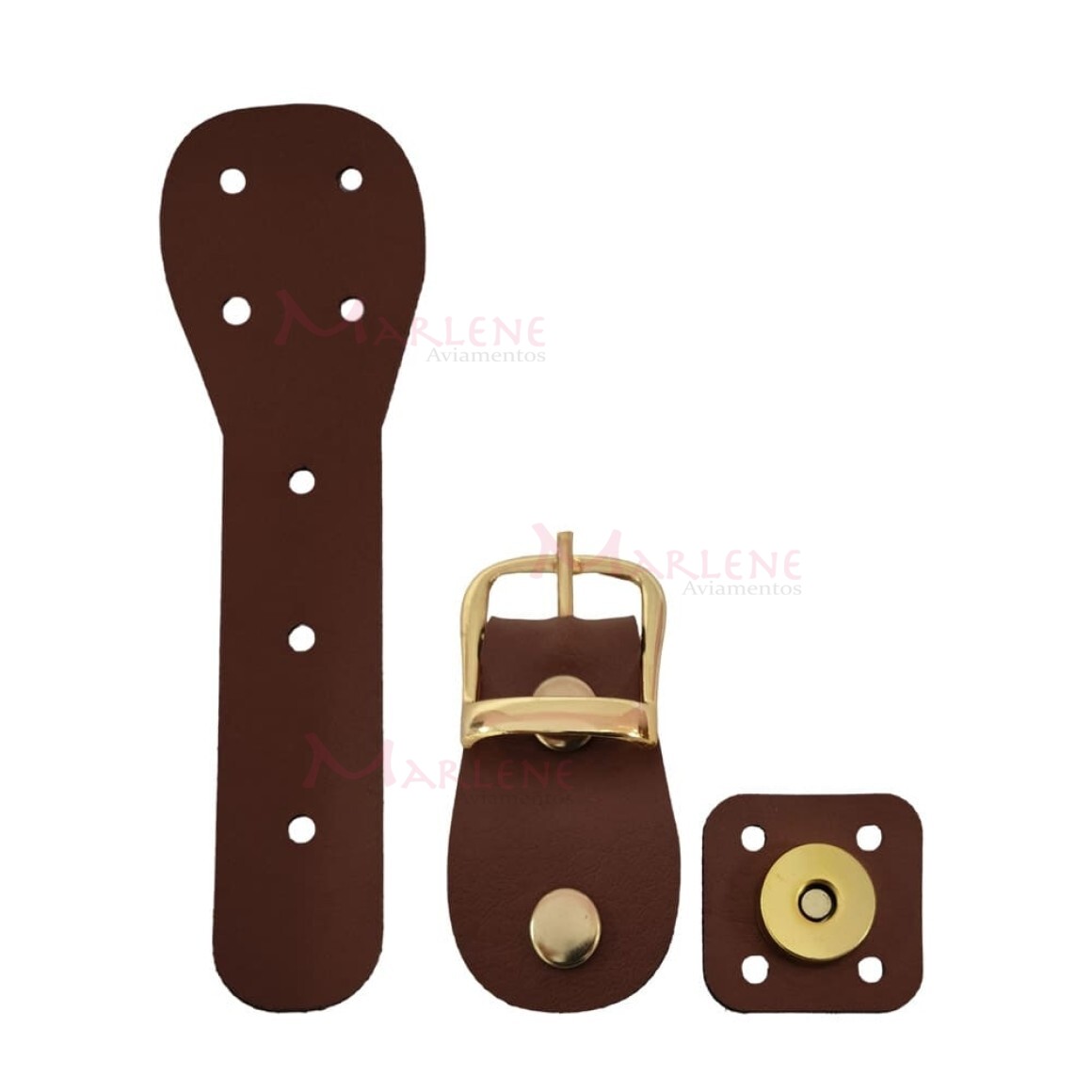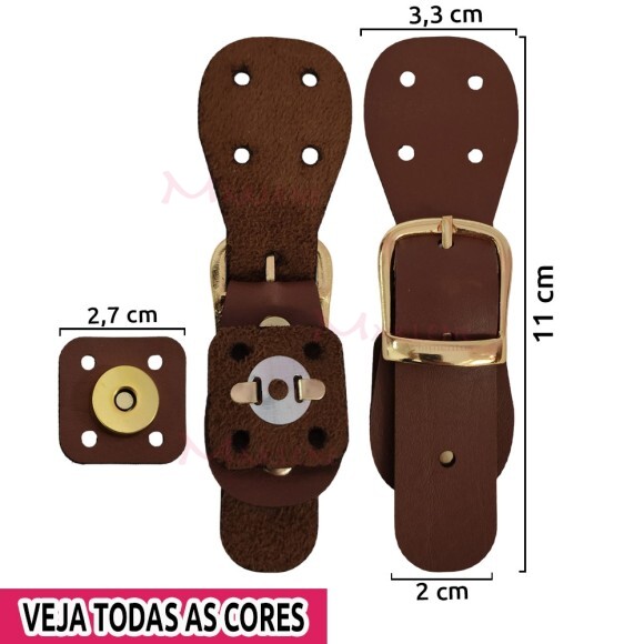 Uso: Fecho usado em bolsas em bolsa de crochê e tricô, entre outros adereços com fecho. Feito em material de couro sintético, botão ímã 14mm rebites nº3 e fivela metal, deixando o seu trabalho elegante. Esse modelo não precisa ser rebitado, é simplesmente costurado.