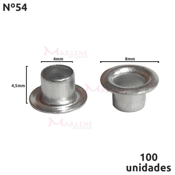 Uso: O ilhós nº54 é usado para aplicação em roupas, bolsas, cintos, tênis, entre outros materiais no qual você queira passar algum fio mais estreito. Possui a grande vantagem de não enferrujar.