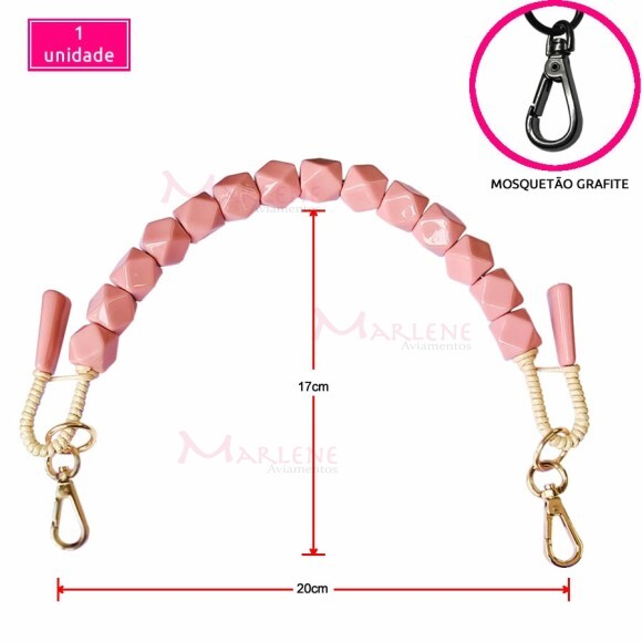 Detalhes: Alça chic com predraria, gancho e mosquetão