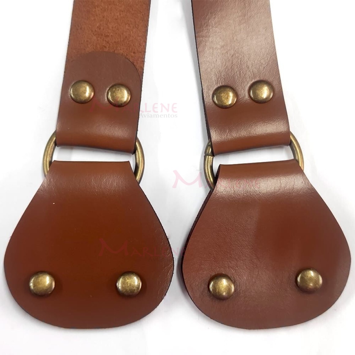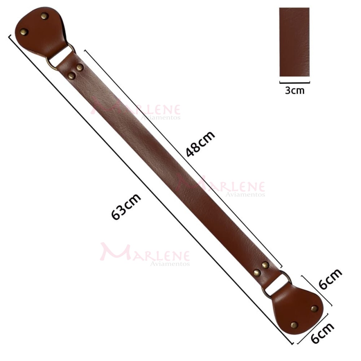 Uso: Alça de bolsa para ombro em couro sintético, fechamento com rebites duplos e argola de ferro. Utilizada para bolsa de crochê, tricô, entre outros. Deixa sua bolsa bonita e elegante.