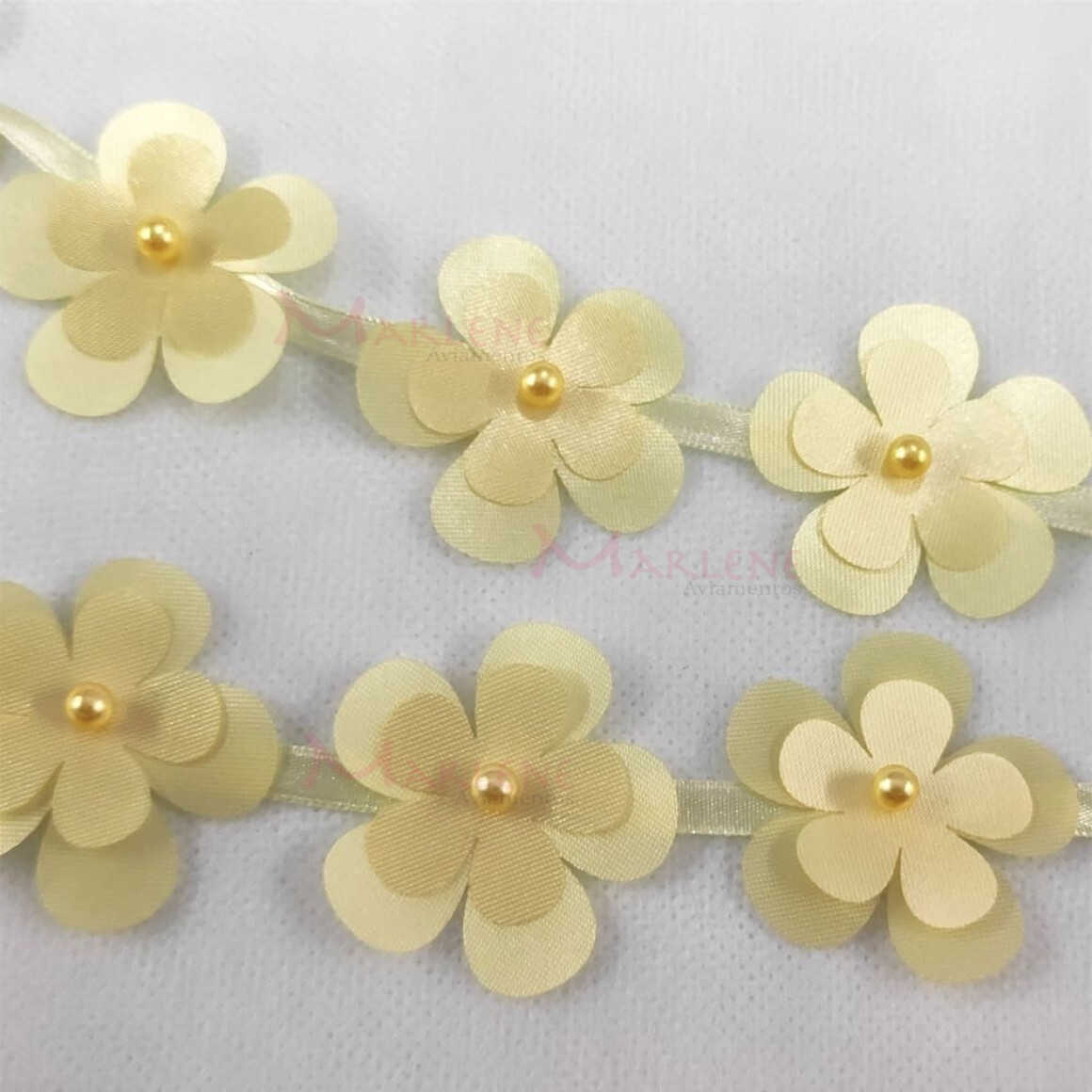 Características: Flor de cetim com pérola usada para customização com tema jardim encatando. Podem ser usadas em vestidos, sapatos, bolsas de tecido, nécessaire de tecido, entre outros trabalhos criativos. Ficam super delicadas e lindas. Vendidas por metro individual. Cada metro contém 20 pétalas.