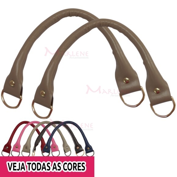 Uso: Alça de mão em couro sintético, usada em bolsas de corino, crochê, tricô, outros acessórios. Alça pronta só para encaixar a meia argola na bolsa, seja em mosquetão ou diretamente na bolsa.