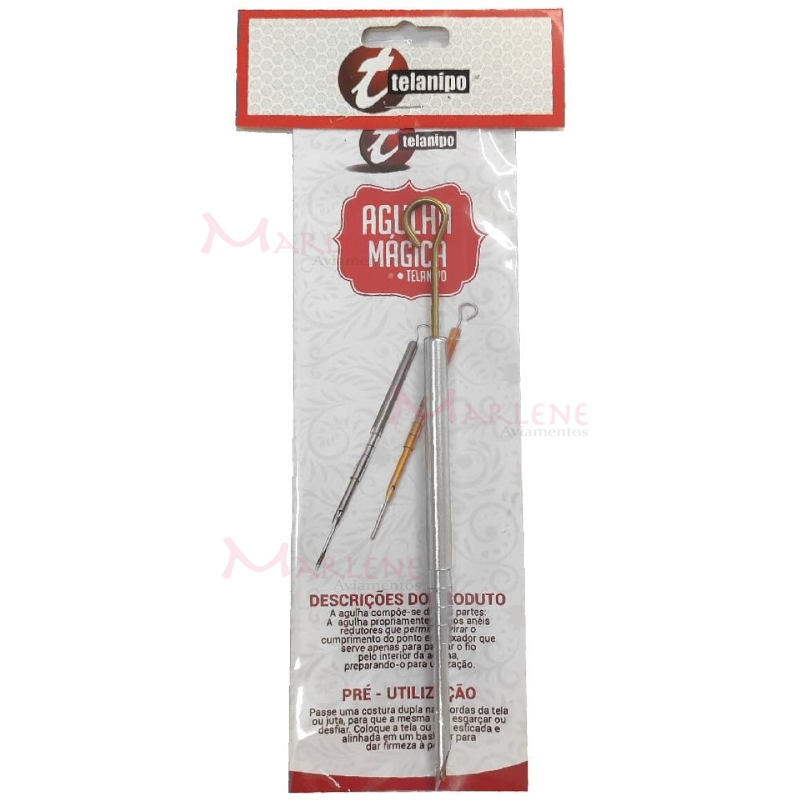 Uso: Usada para bordado com bastidor utilizando juta ou talagarça, na confecção de tapetes, almofadas, quadros e outros itens de decoração. Formada por três partes: A agulha propriamente dita, os anéis redutores, que permitem virar o cumprimento do ponto e o puxador que serve para passar o fio pela parte interna da agulha, deixando-o pronto para utilização.