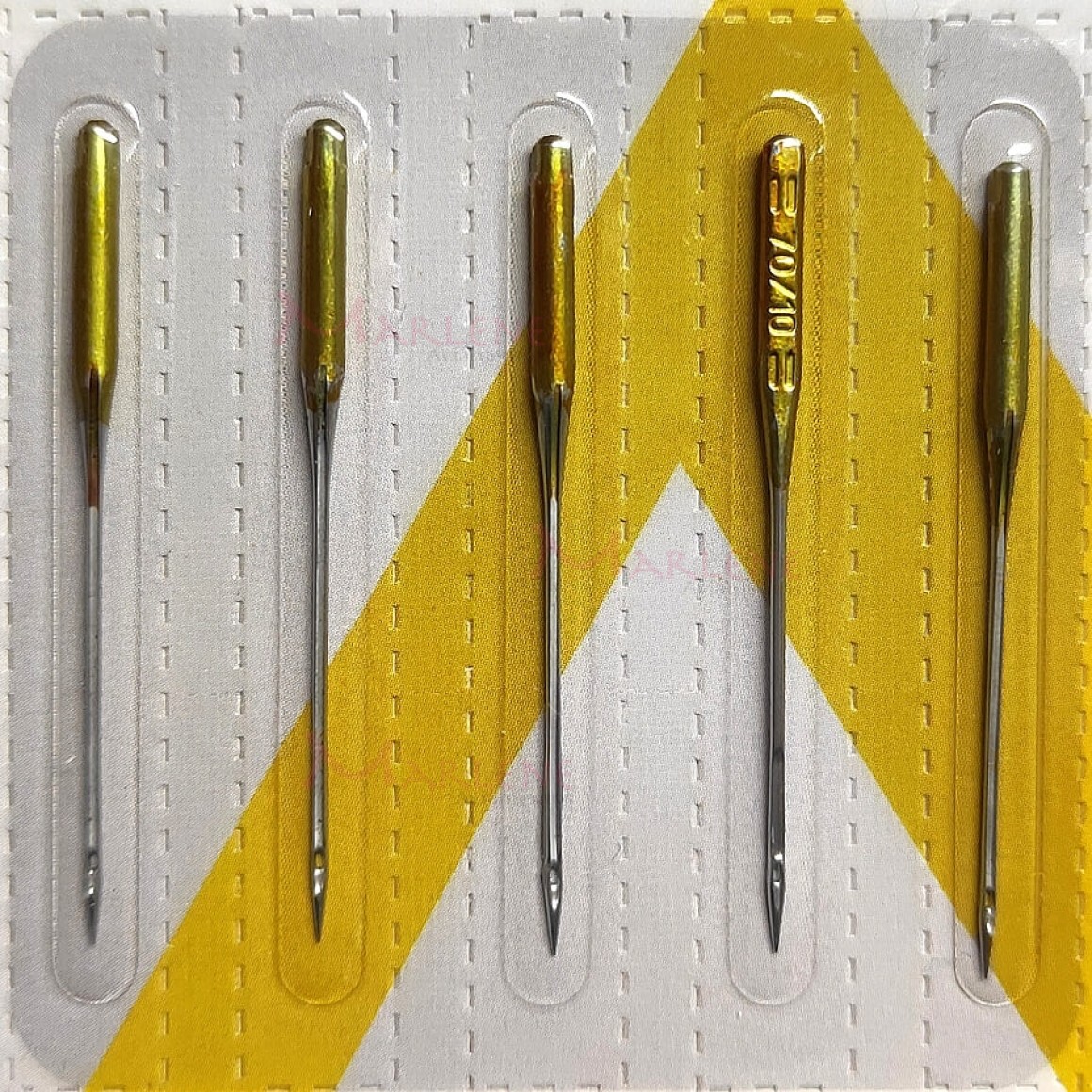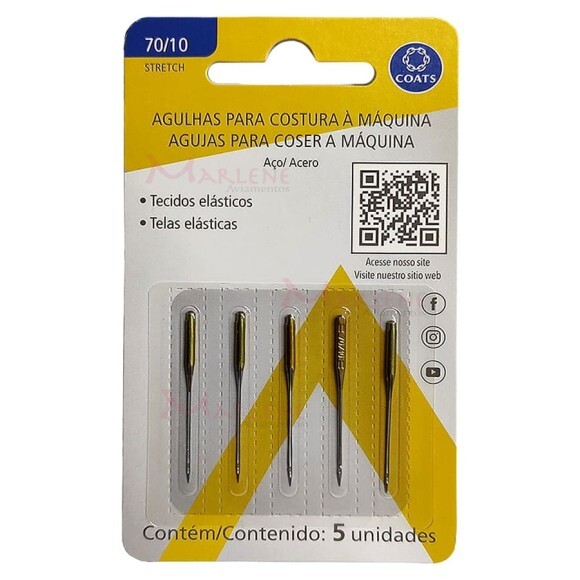 Uso: Agulha ponta bola, usada em máquinas domésticas para costura de tecidos de malha ou tecidos elásticos. Tamanho indicado para tecidos leves.