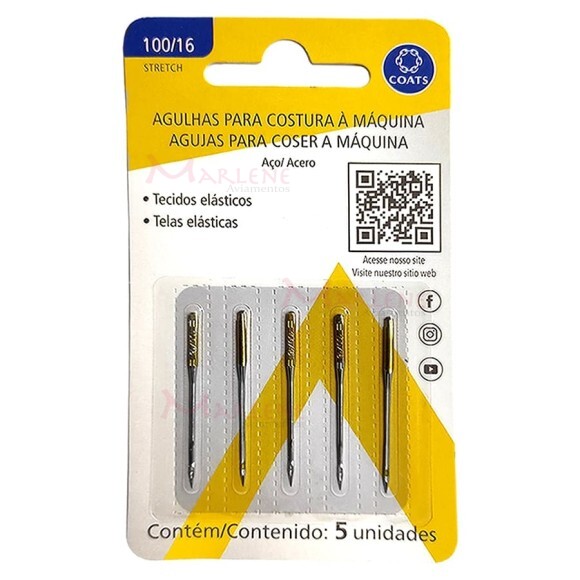 Uso: Agulha ponta bola, usada em máquinas domésticas para costura de tecidos de malha ou tecidos elásticos. Tamanho indicado para tecidos médios-pesados.