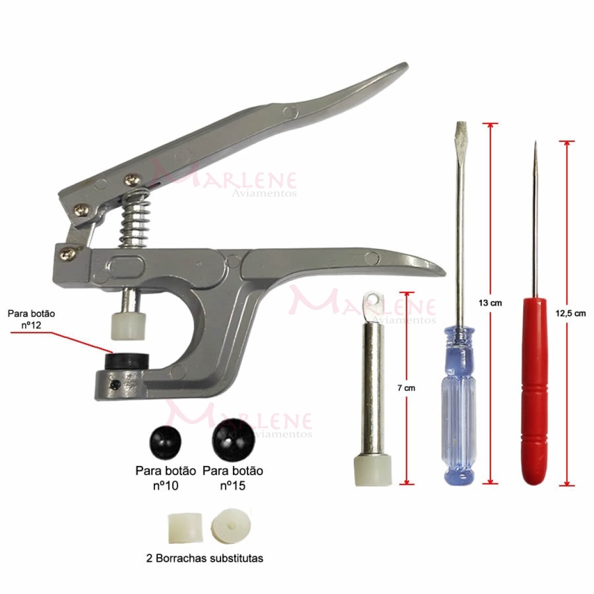 Quantidade: 1 kit (alicate, base para nº10, 12, 15, haste superior para botão nº15 e chave para substituição da haste, 1 furador manual e 2 borrachas para a parte inferior das hastes)