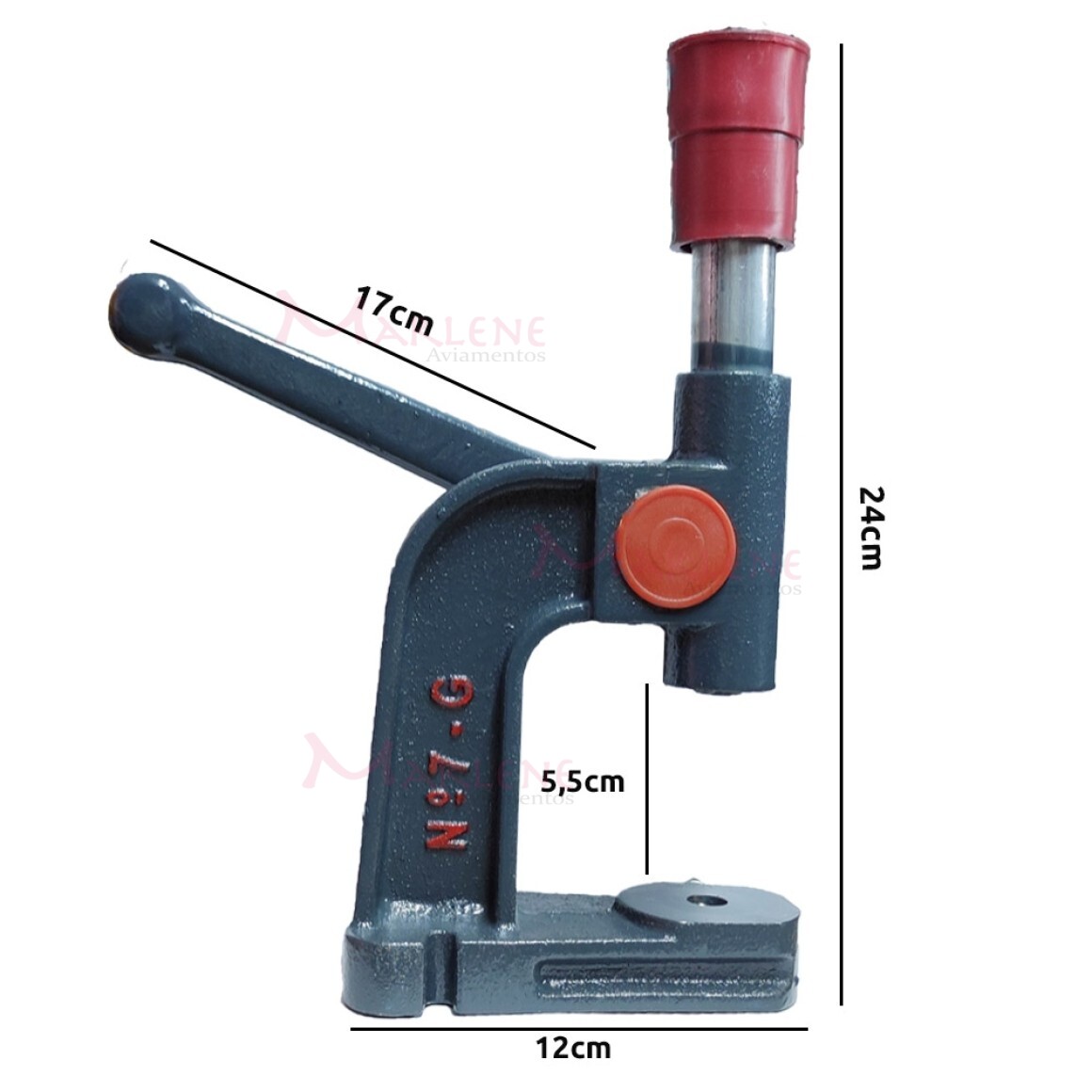Uso: O balancim é utilizado para a colocação de botões de pressão plástico ou de metal, botão jeans, ilhóses, rebites, forrar botões, entre outros materiais. O balancim nº7 é equivalente ao balancim 100, ou seja, significa que a pressão que o mesmo consegue exercer é equivalente a 100kg. Para cada tipo de material que for utilizado, geralmente se usa uma matriz específica, consulte-nos, caso tenha dúvidas.