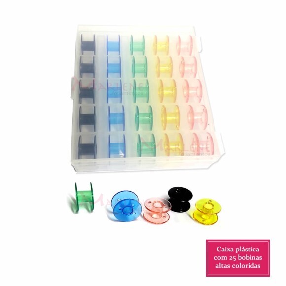 Detalhes: Caixa com 25 bobinas coloridas altas para máquina doméstica