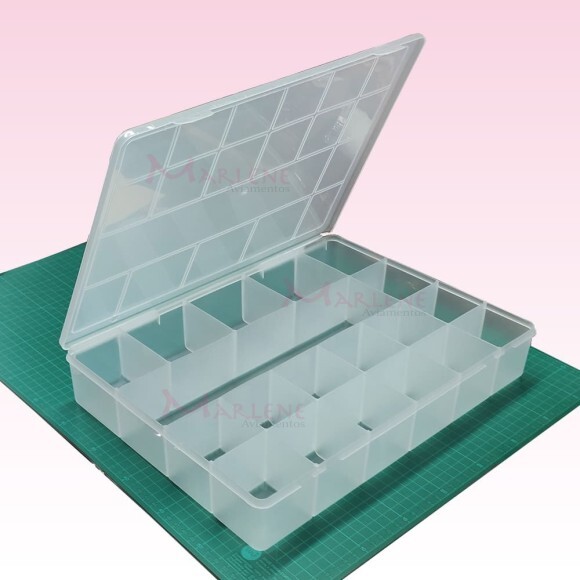Uso: Caixa plástica grande usada para organizar objetos de costura como botões, bobinas e cursores. Serve também para parafusos, presilhas, bijouterias, remédios, itens escolar, material de pesca e ferramentas.