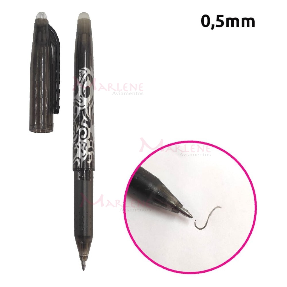 Uso: Caneta usada em tecidos e apagável com calor, pode ser com o ferro (temperatura de 60º) ou por fricção com a outra ponta emborrachada da caneta.