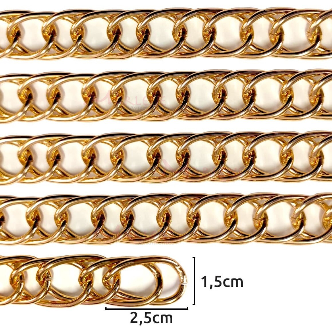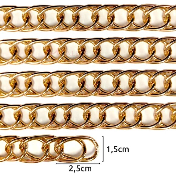 Uso: Corrente de alumínio utilizada principalmente para alça de bolsa ou para cintos, é super resistente e elegante. Além disso, por ser de alumínio, pode ser usada em vestuário sem medo de enferrujar.