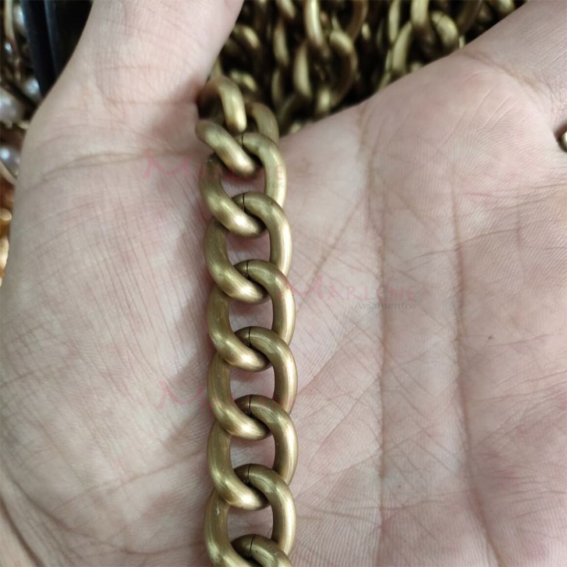 Uso: Corrente de alumínio utilizada principalmente para alça de bolsa ou para cintos, é super resistente e elegante. Além disso, por ser de alumínio, pode ser usada em vestuário sem medo de enferrujar.
