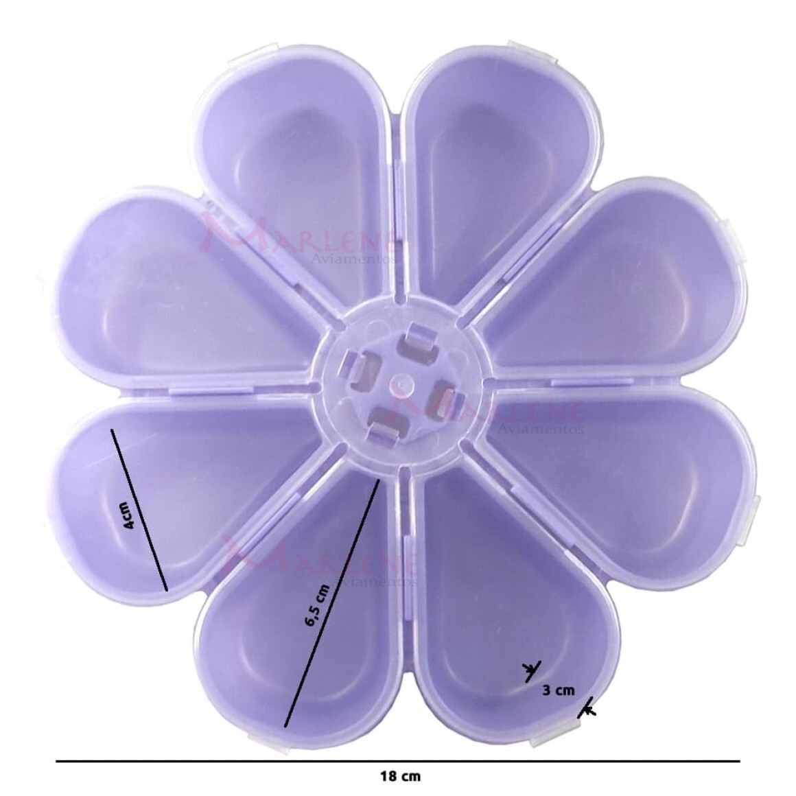 Uso: Caixa plástica em formato de flor margarida usada para organizar objetos de costura como botões, bobinas, cursores, retroz de linhas, entre outros itens, além de poder ser usada como organizador de joias.