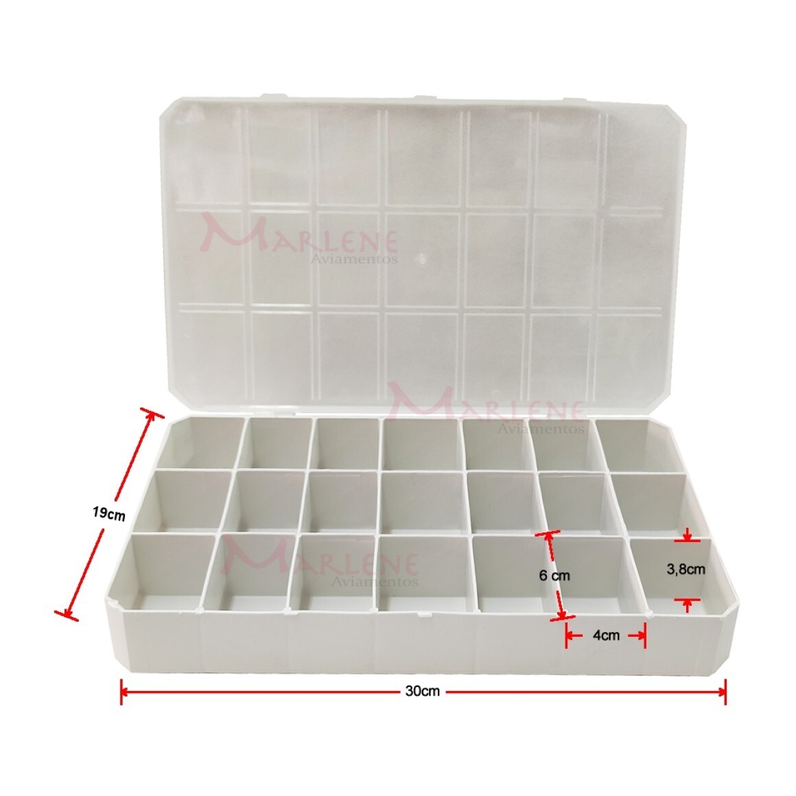 Detalhes: Estojo retangular branco gelo com 21 divisórias