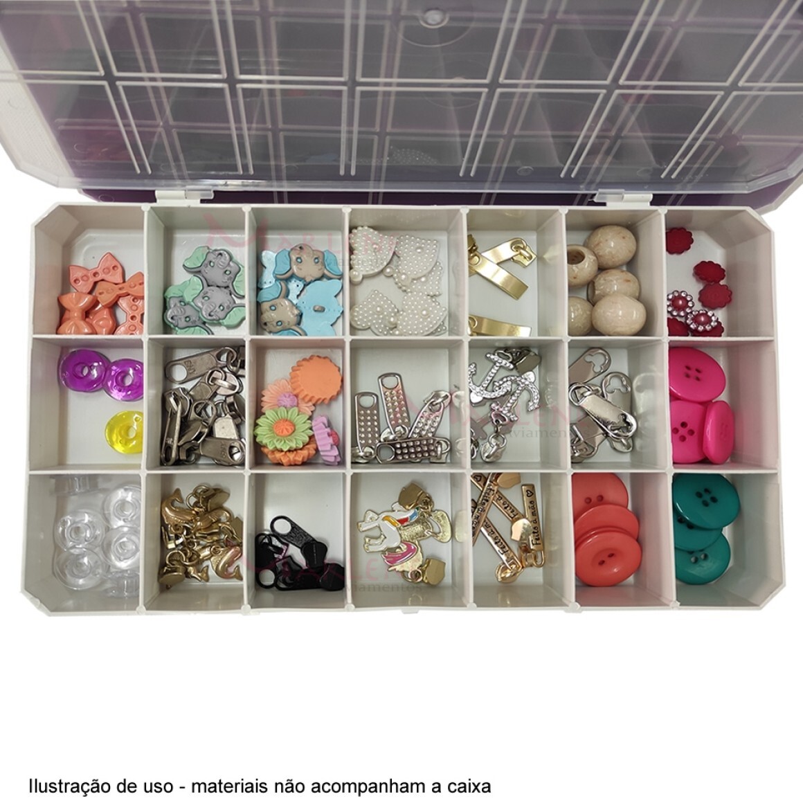 Uso: Caixa usada para organizar objetos de costura como botões, bobinas, cursores, entre outros, além de outros itens como joias e outros.