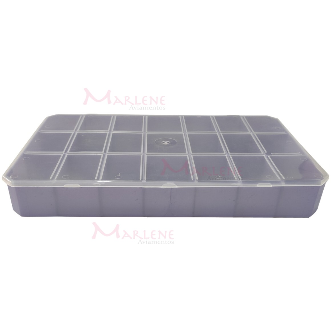 Detalhes: Estojo retangular lilás com 21 divisórias