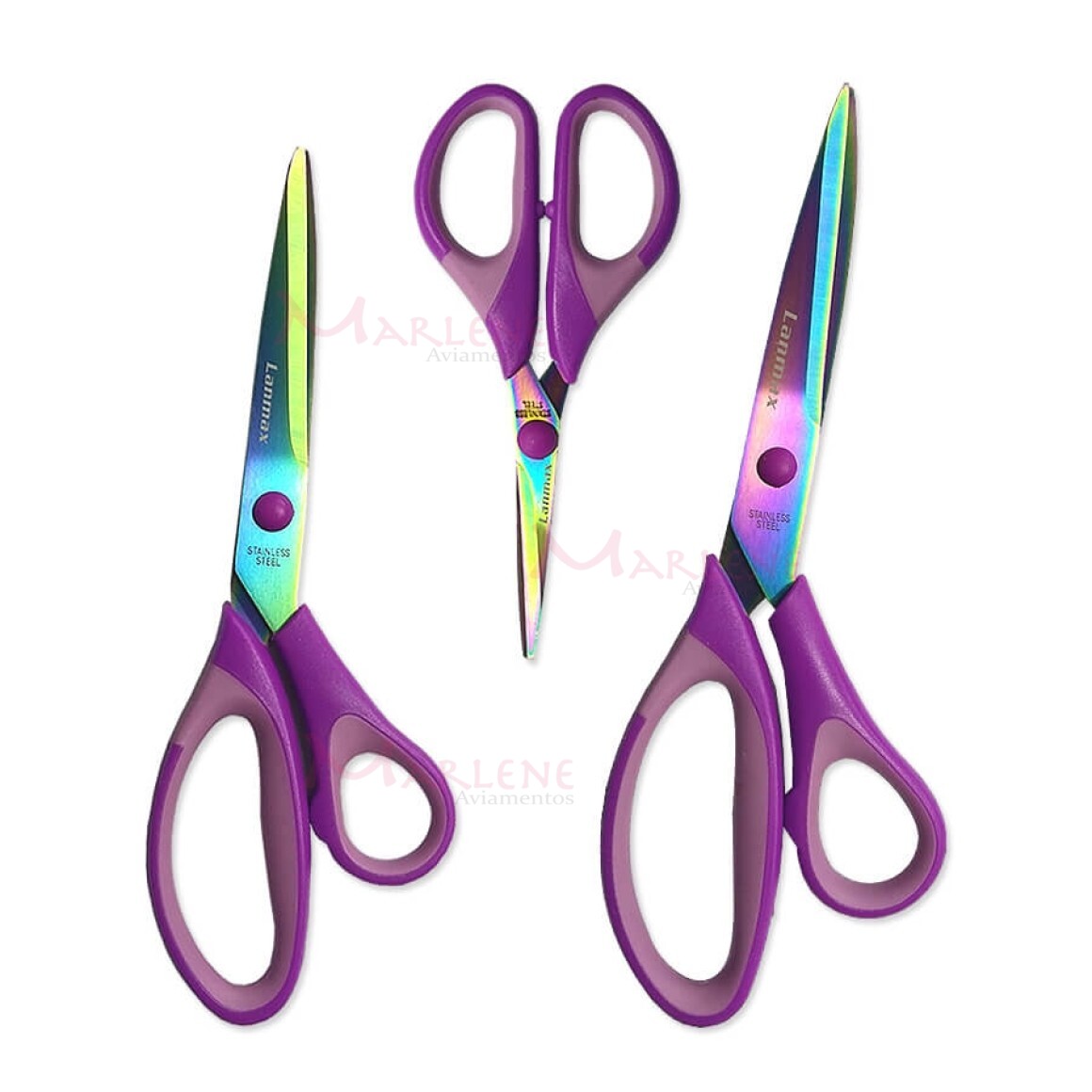 Uso: Usado para cortes em costura, patchwork e em bordados. Lâminas em titânio, o que prolonga o corte da tesoura. Cabo soft, podendo ser usada por destros ou canhotos. Formado pelos seguintes tamanhos: 10 polegadas, usada em costura, geralmente, 8,5 polegadas, também usada em costura e 5,5 polegadas, usualmente utilizada em bordados.