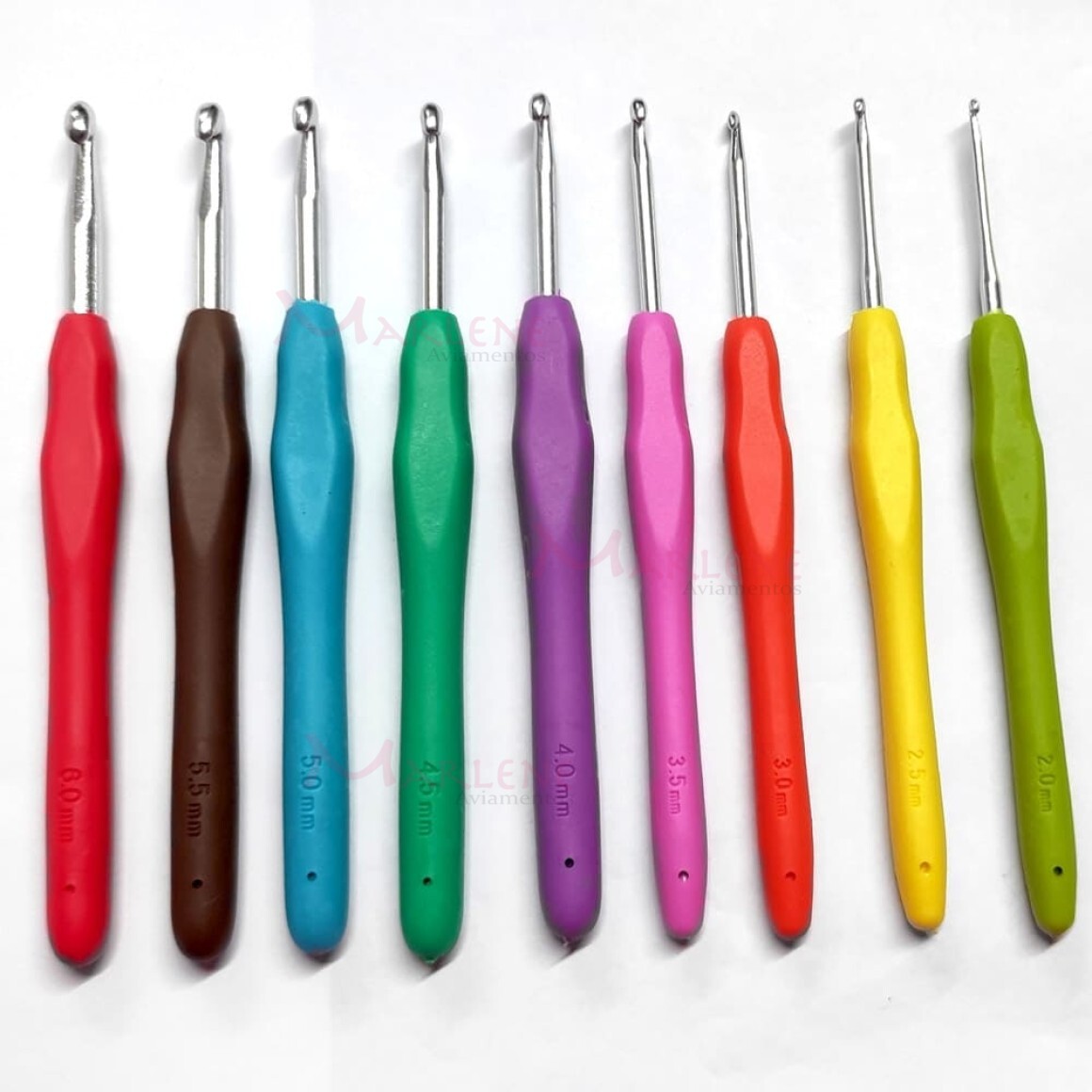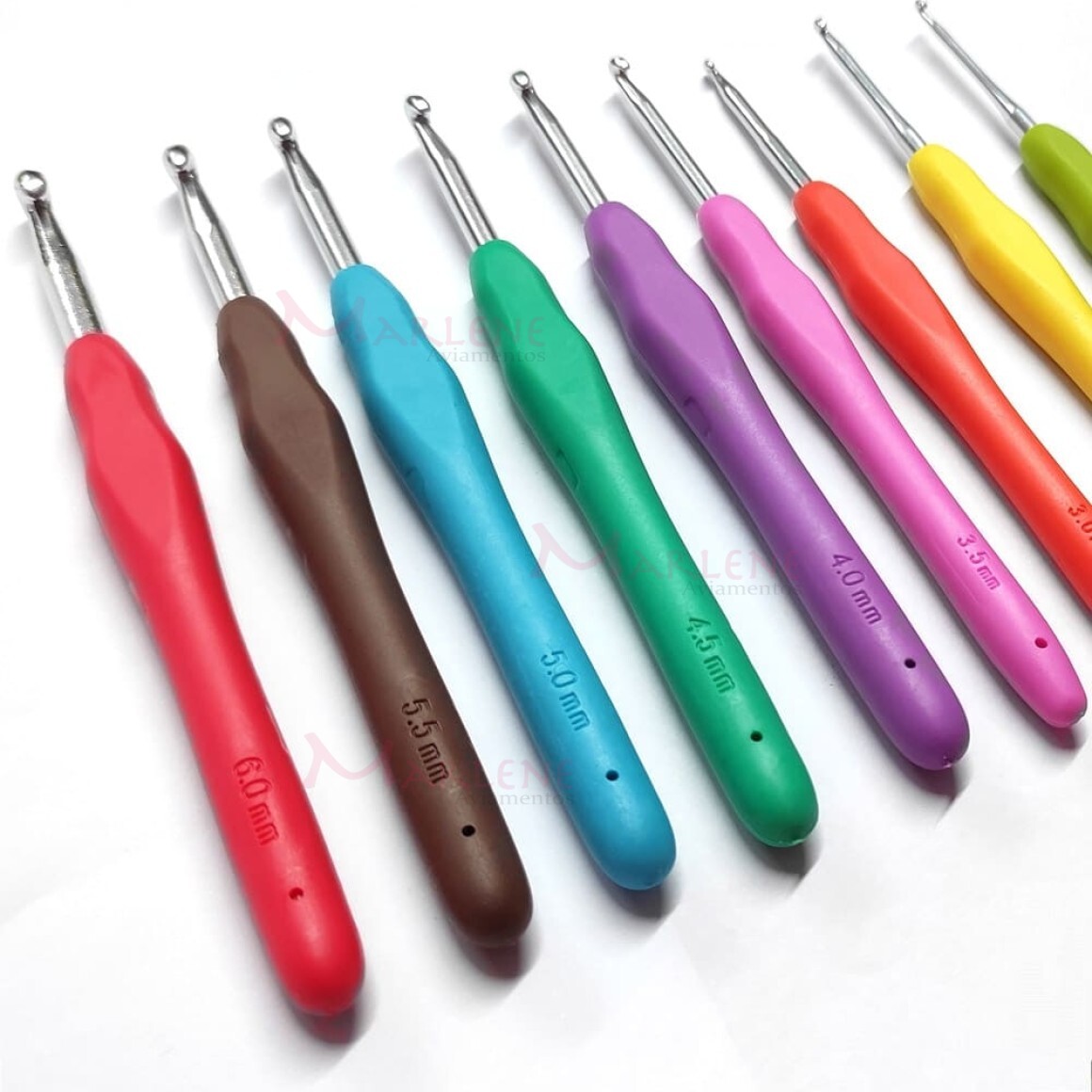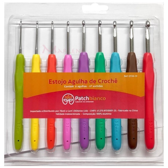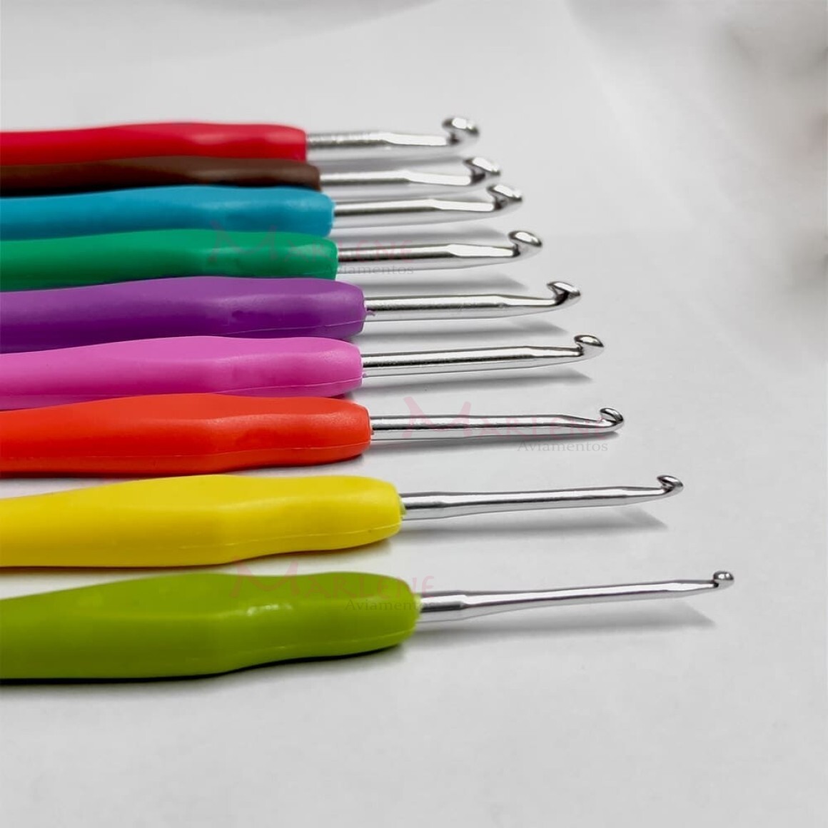 Uso: Usada para fazer crochê, com 9 tamanhos, ideal para diversos tipos de trabalhos. Com sua estrutura de alumínio e cabo emborrachado, são leves e práticas, tornam o manuseio bem confortável.