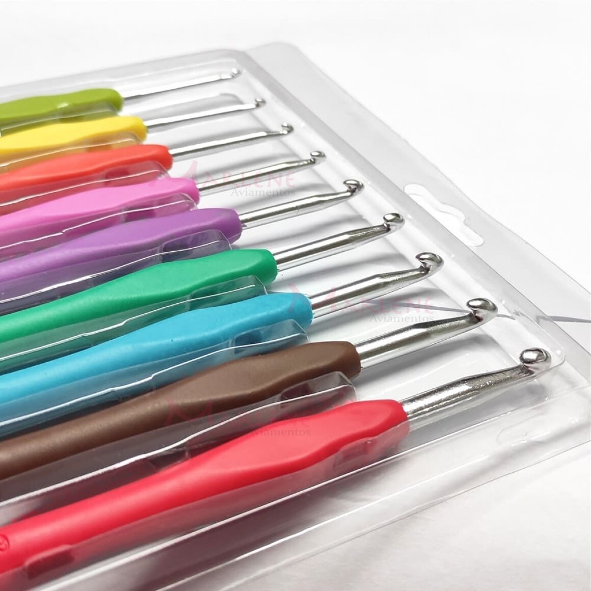 Detalhes: Kit agulhas de crochê com 9 unidades cabo emborrachado