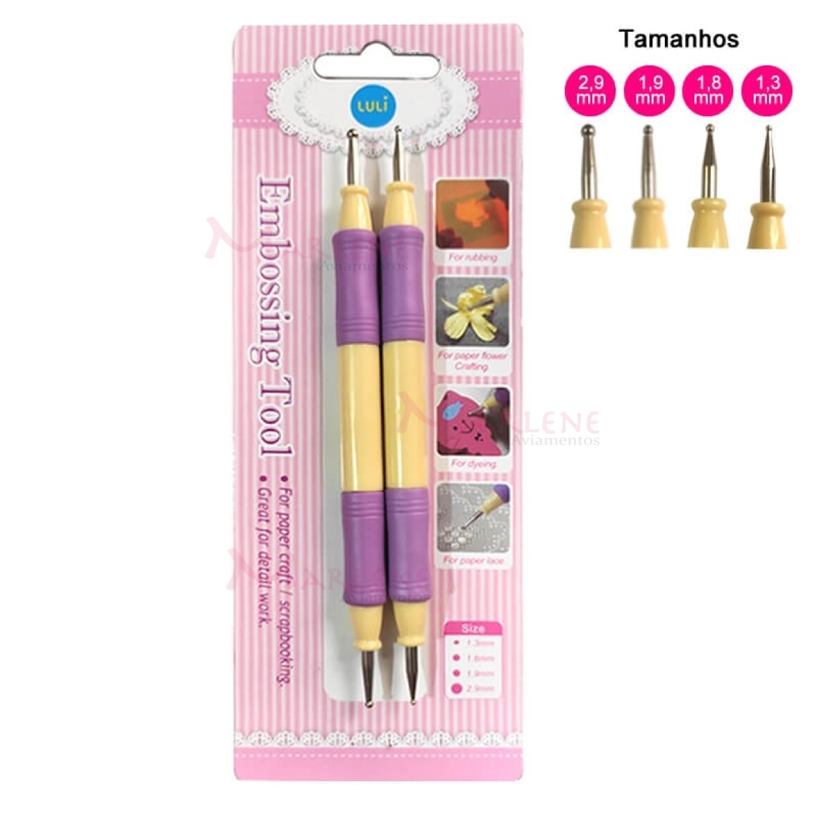 Uso: Usado para modelar e detalhar formas para pétalas e folhas de marzipã, pasta de açúcar, pasta americana ou biscuit, modelar flores de papel, detlahes em pinturas (rendas, flores, etc.), além de outras funções. Possui 4 tamanhos (diâmetro aproximado): 1.3mm, 1.8mm, 1.9mm e 2.9mm.
