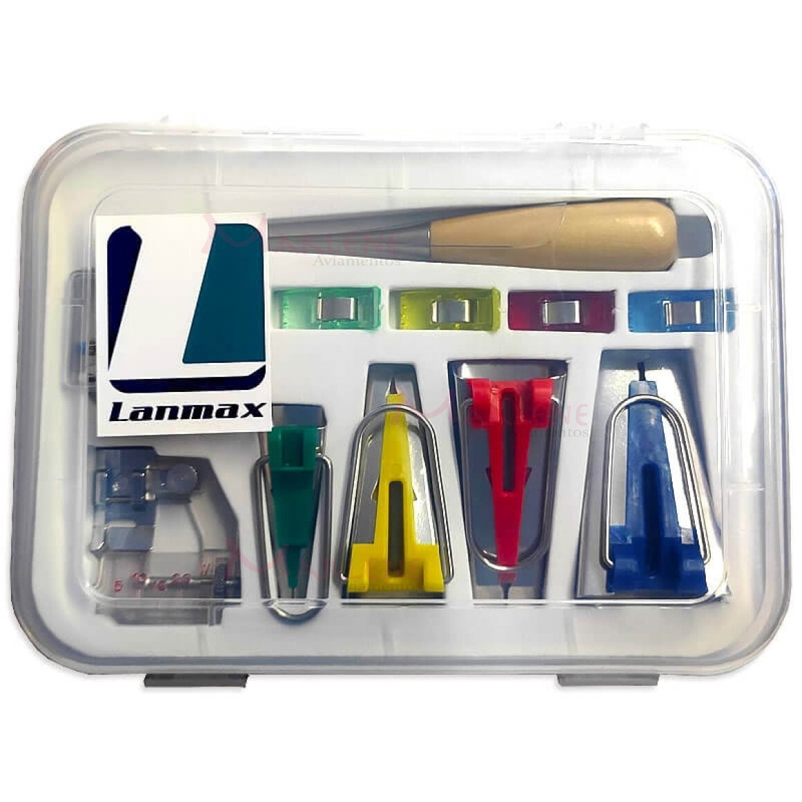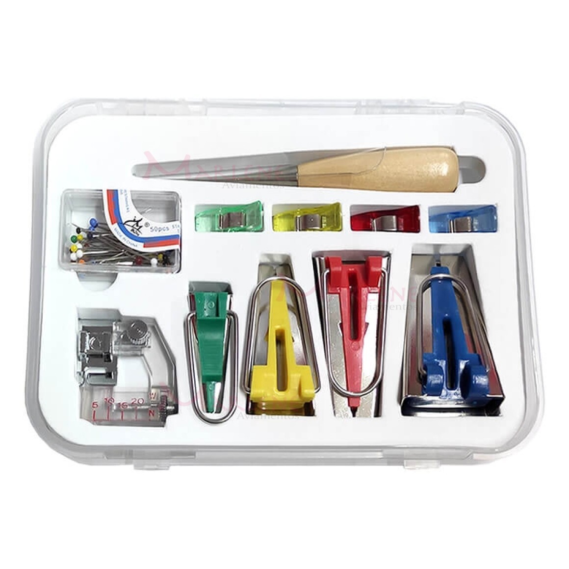 Uso: O kit faz viés possui 4 tamanhos para que você possa usar o seu próprio tecido e fazer o viés com as suas estampas preferidas. Acompanha também os acessórios auxiliares: prendedor de patch (para segurar o tecido), alfinetes cabeça de vidro (para ajudar a fixar o tecido na hora de fazer o viés), furador manual (auxiliar na passagem do tecido pelos aparelhos) e um calcador para colocar víes na máquina doméstica (possui ajuste, facilitando a costura de mais de uma largura de viés).