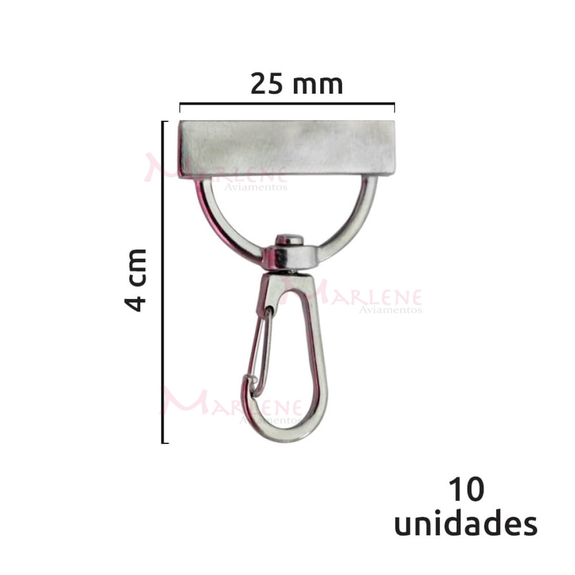 Detalhes: Mosquetão 25mm com encaixe níquel 10 unidades