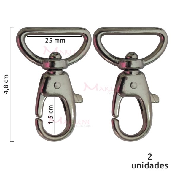 Detalhes: Mosquetão 25mm níquel gordo com gatilho 6004 com 2 unidades no pacote.