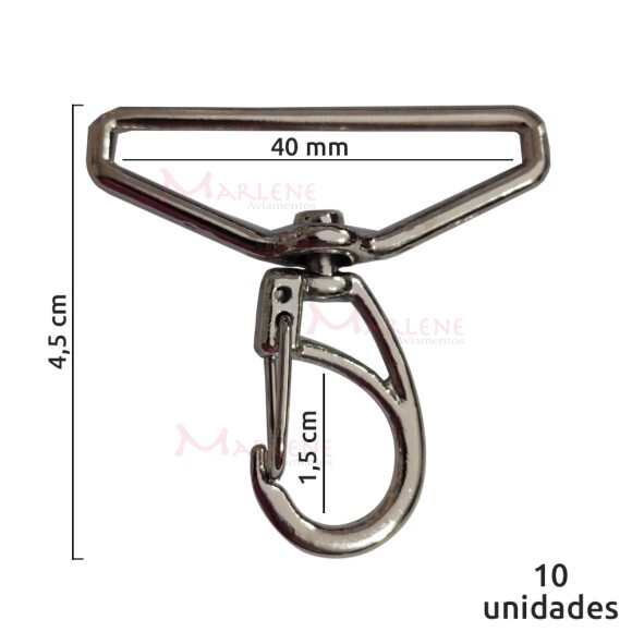 Uso: Mosquetão usado em bolsas, mochilas, acessórios decorativos, chaveiros, entre outros.