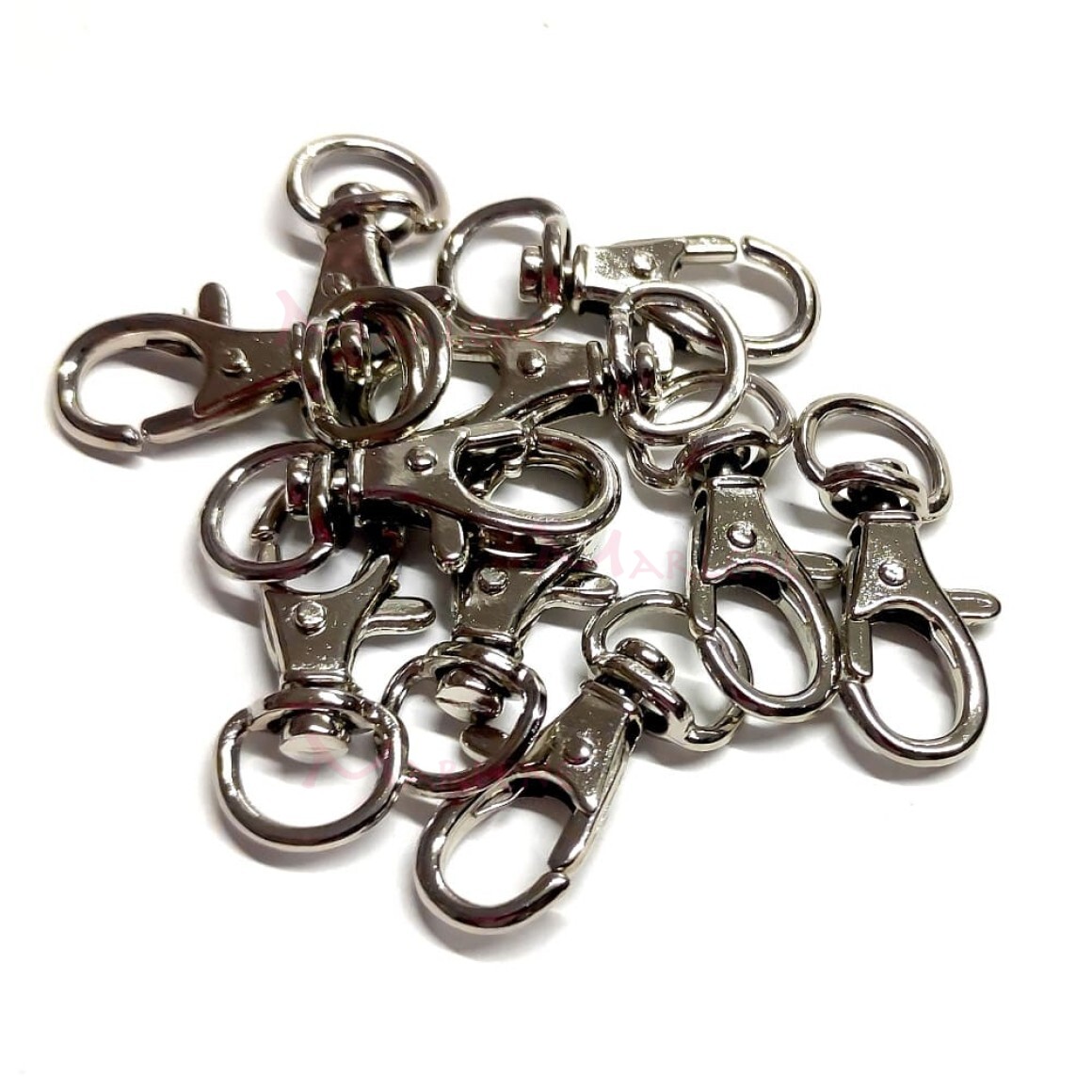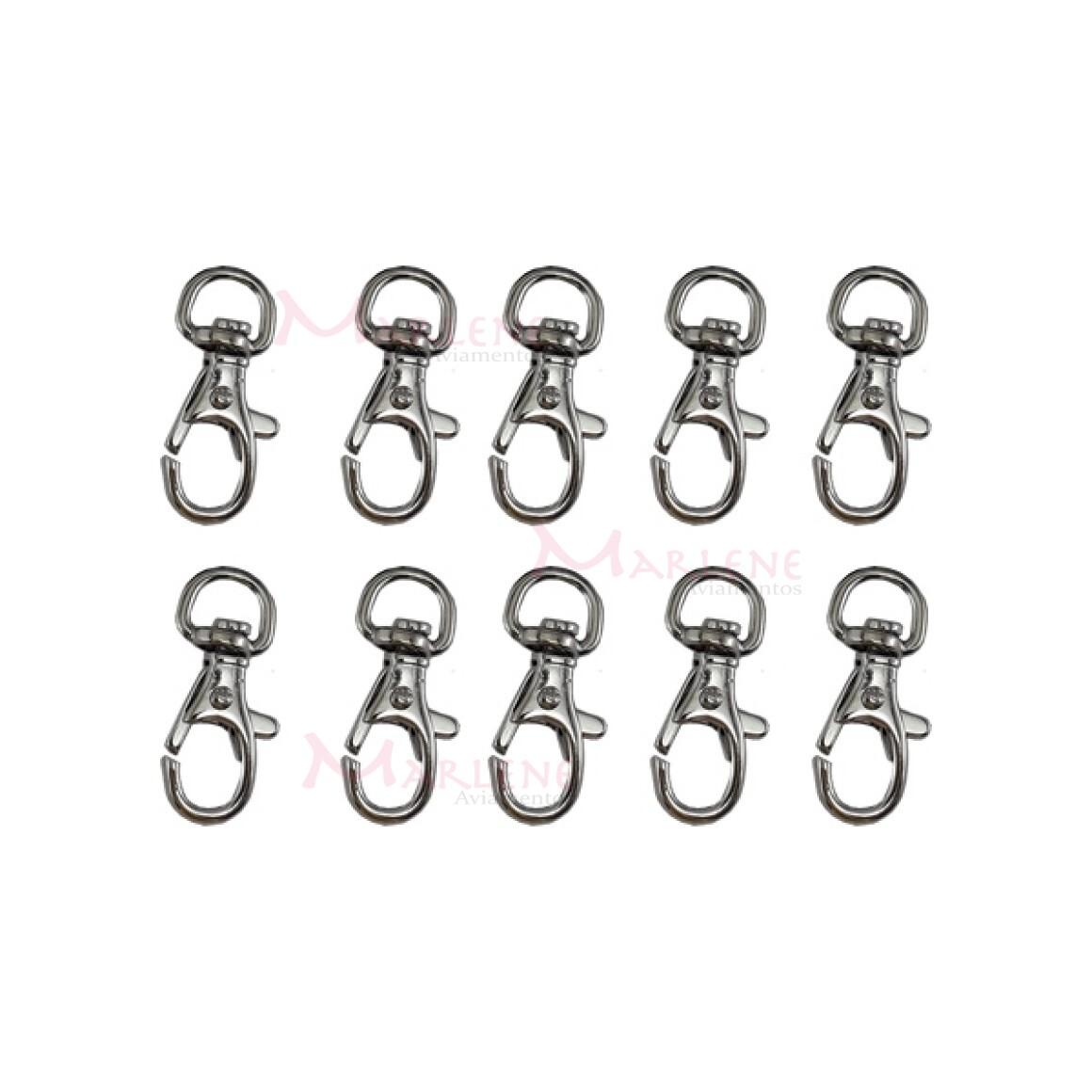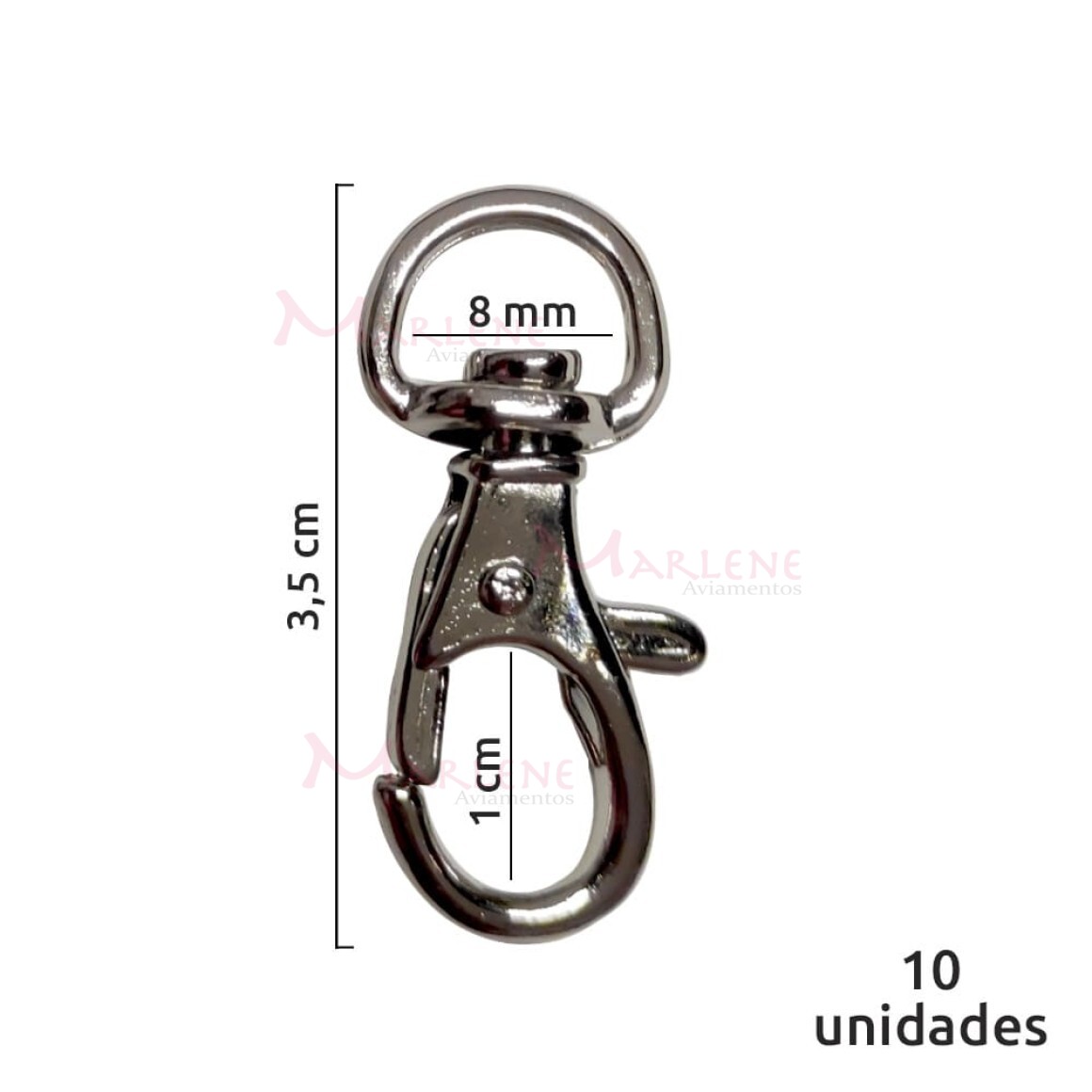 Uso: Mosquetão usado em bolsas, mochilas, acessórios decorativos, chaveiros, entre outros. Possui uma alavanca para auxiliar na abertura.