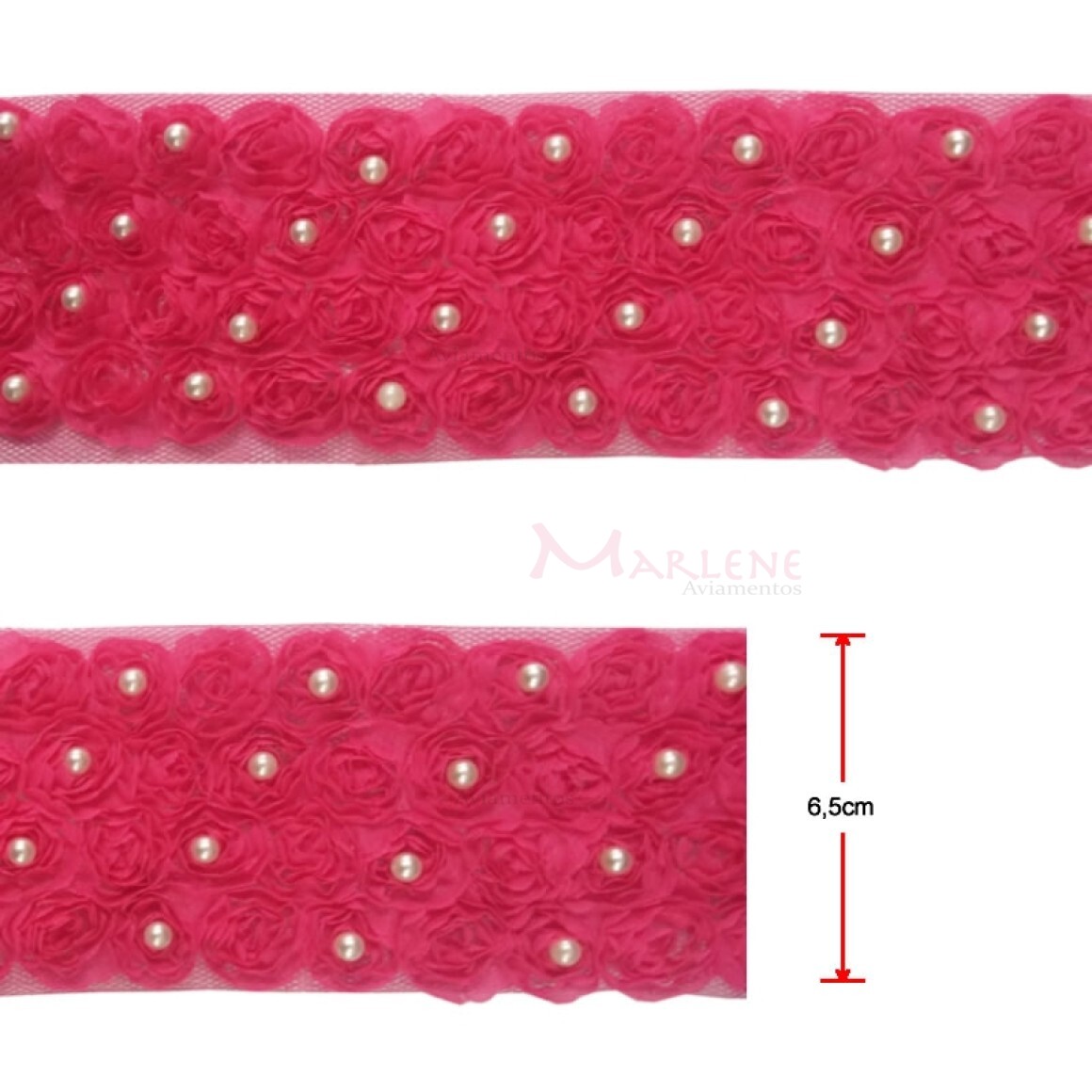 Detalhes: Passamanaria flor 4 fileiras com pérolas pink por metro