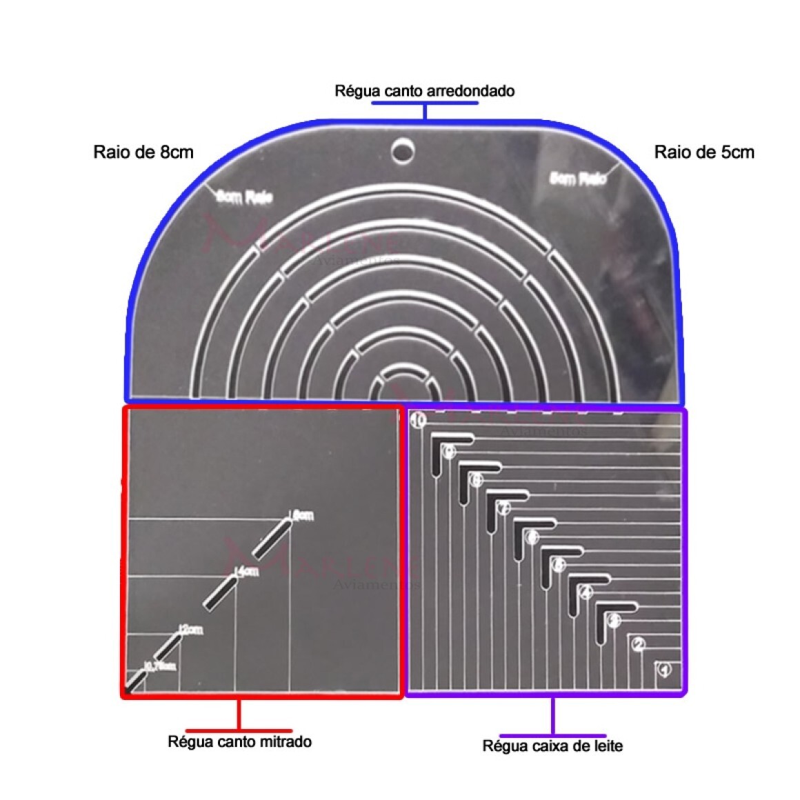 Detalhes: Régua 3 em 1 20x20 - Canto mitrado, caixa de leite e circular.
