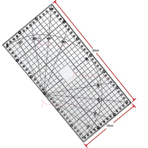 Uso: Usado para trabalhos em patchwork, por exemplo, tecidos, moldes, retalhos quadrículados, entre outros. Sua transparência facilita na hora de trabalhar com tecidos coloridos. Possui marcaçao em cm e internamente quadriculados de 1cm², além de ângulos de 15º,30º, 45º, 60º e 90º.