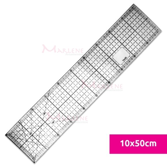 Uso: Régua usada para trabalhos em patchwork, por exemplo, tecidos, moldes, retalhos quadrículados, entre outros. Excelente para cortes de tiras de tecido mais alongadas. Sua transparência facilita na hora de trabalhar com tecidos coloridos. Possui marcaçao em cm e internamente quadriculados de 1cm², além de ângulos de 30º, 45º e 60º.
