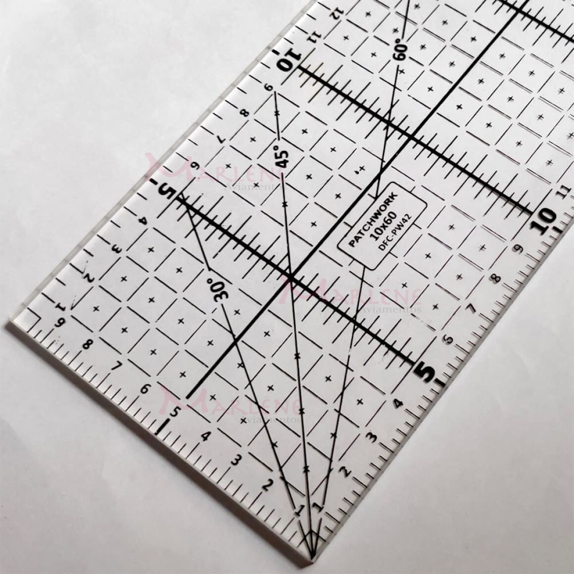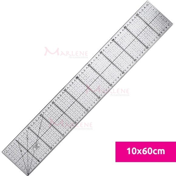 Uso: Régua usada para trabalhos em patchwork, por exemplo, tecidos, moldes, retalhos quadrículados, entre outros. Excelente para cortes de tiras de tecido mais alongadas. Sua transparência facilita na hora de trabalhar com tecidos coloridos. Possui marcaçao em cm e internamente quadriculados de 1cm², além de ângulos de 30º, 45º e 60º.